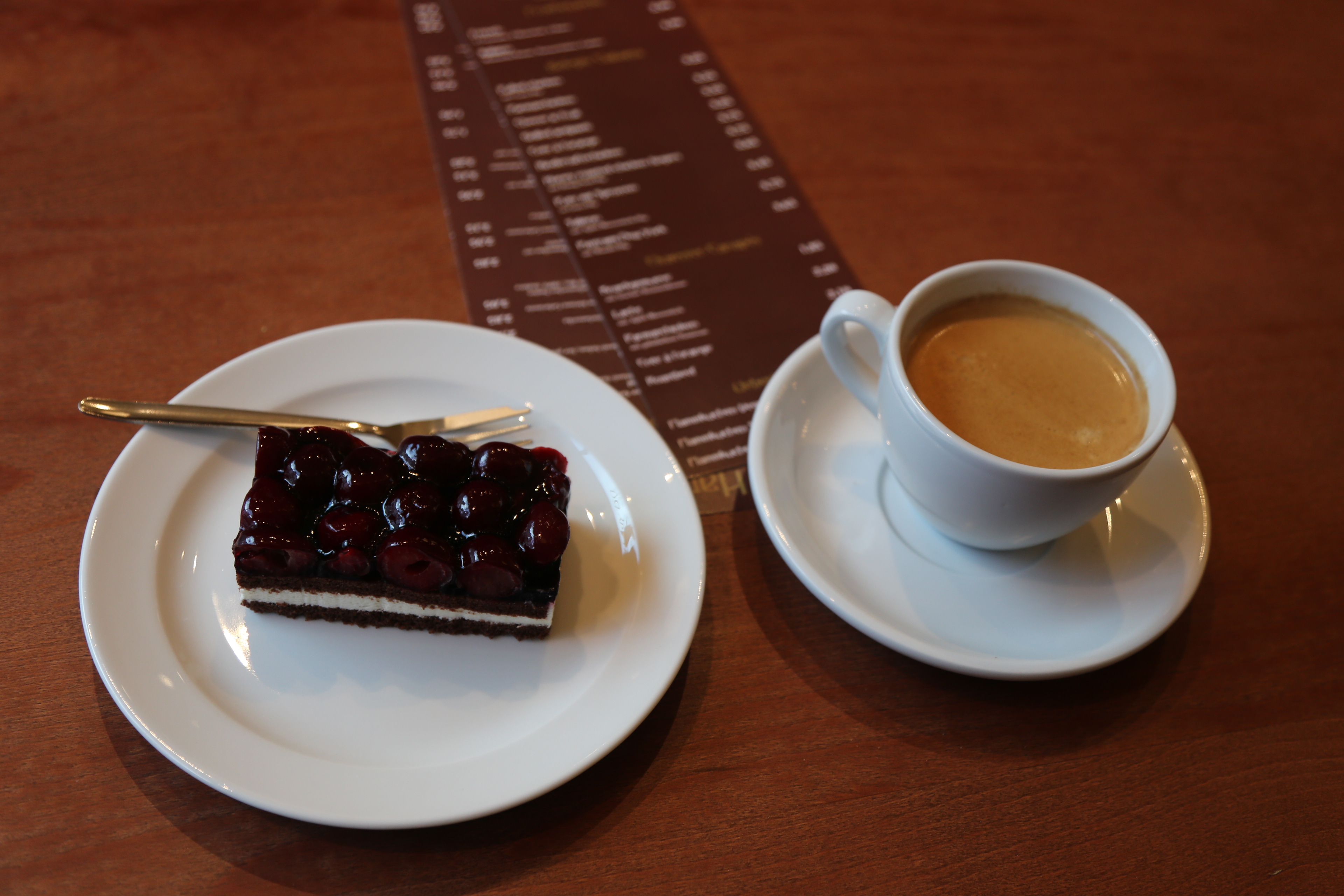 Next to the plate, a white porcelain cup sits on a matching saucer, containing a freshly brewed espresso. The espresso's creamy, golden crema is visible, indicating a well-prepared, rich coffee. The setup suggests a moment of indulgence, perfect for savoring a sweet treat alongside a strong, aromatic coffee.