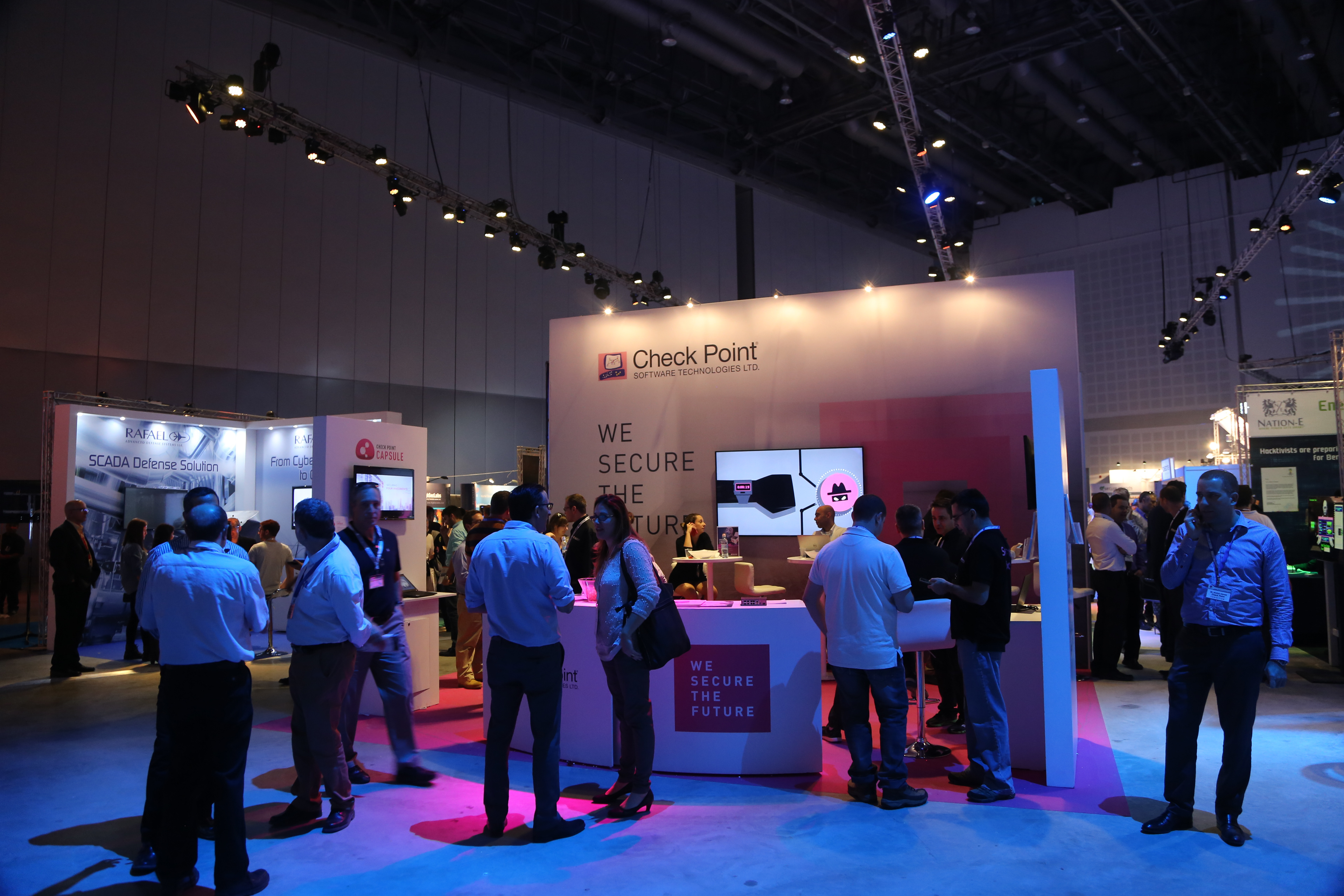 Surrounding the Check Point booth, other exhibition stands are visible, including one for Rafale, which focuses on SCADA Defense Solutions. The background reveals a dimly lit, expansive exhibition hall, with a network of overhead lights and rigging that adds to the overall professional and immersive environment. The attendees' interactions and the various displays create a sense of active engagement and networking, emphasizing the collaborative spirit of the event.