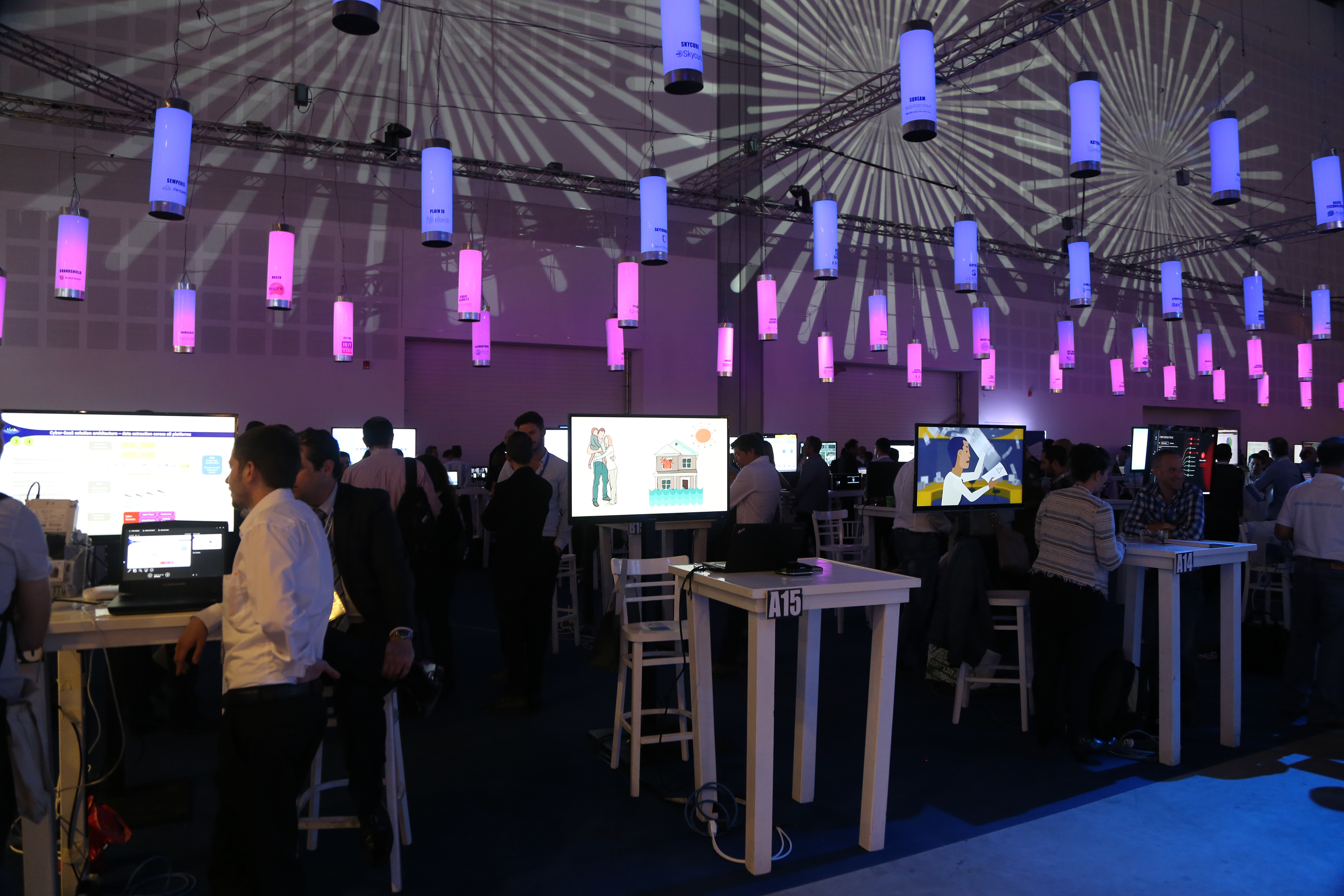 The overall atmosphere is one of active engagement and collaboration, with participants engrossed in the exhibits and discussions. The innovative lighting design and the modern setup of the booths contribute to the impression of a cutting-edge event focused on technology and innovation.