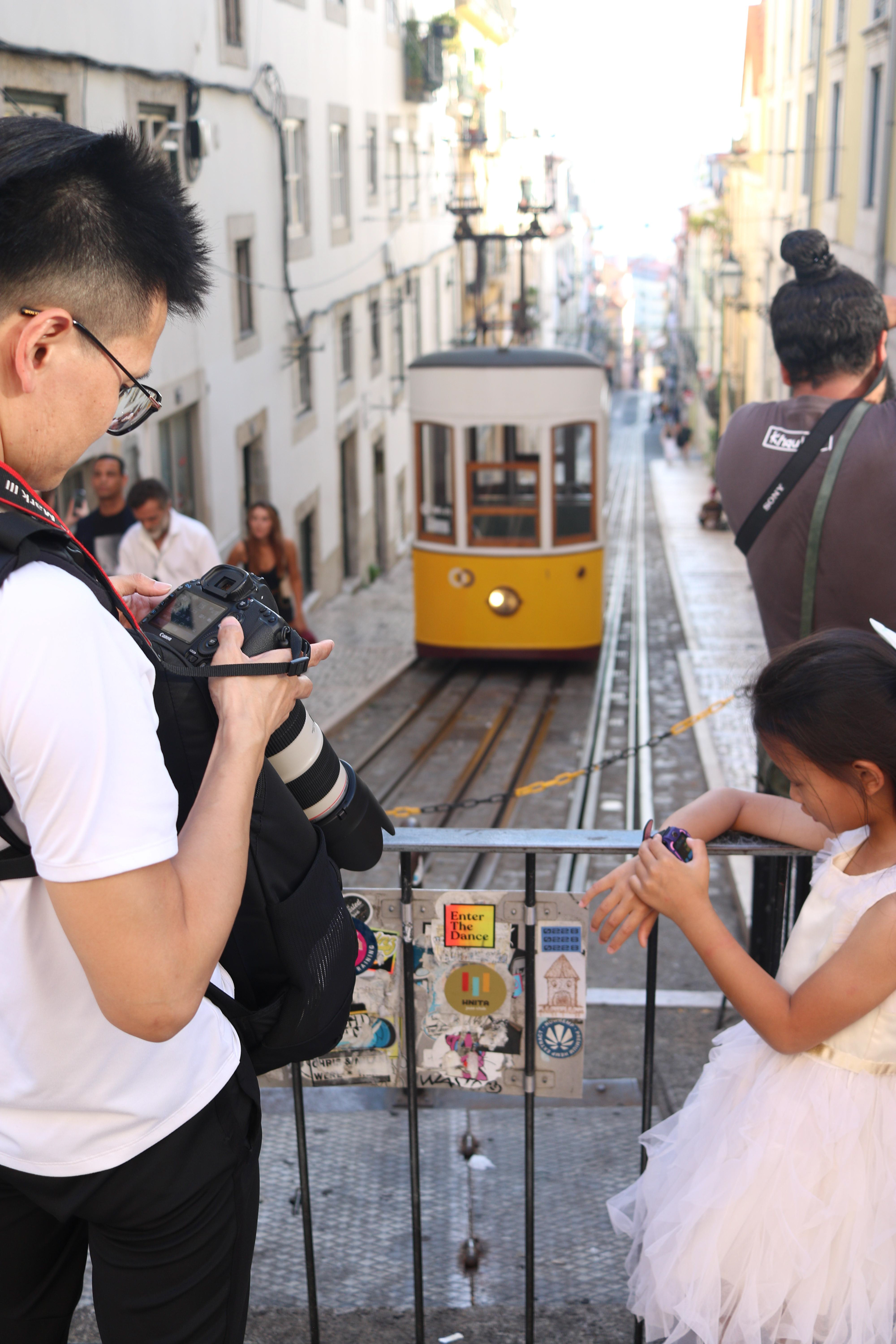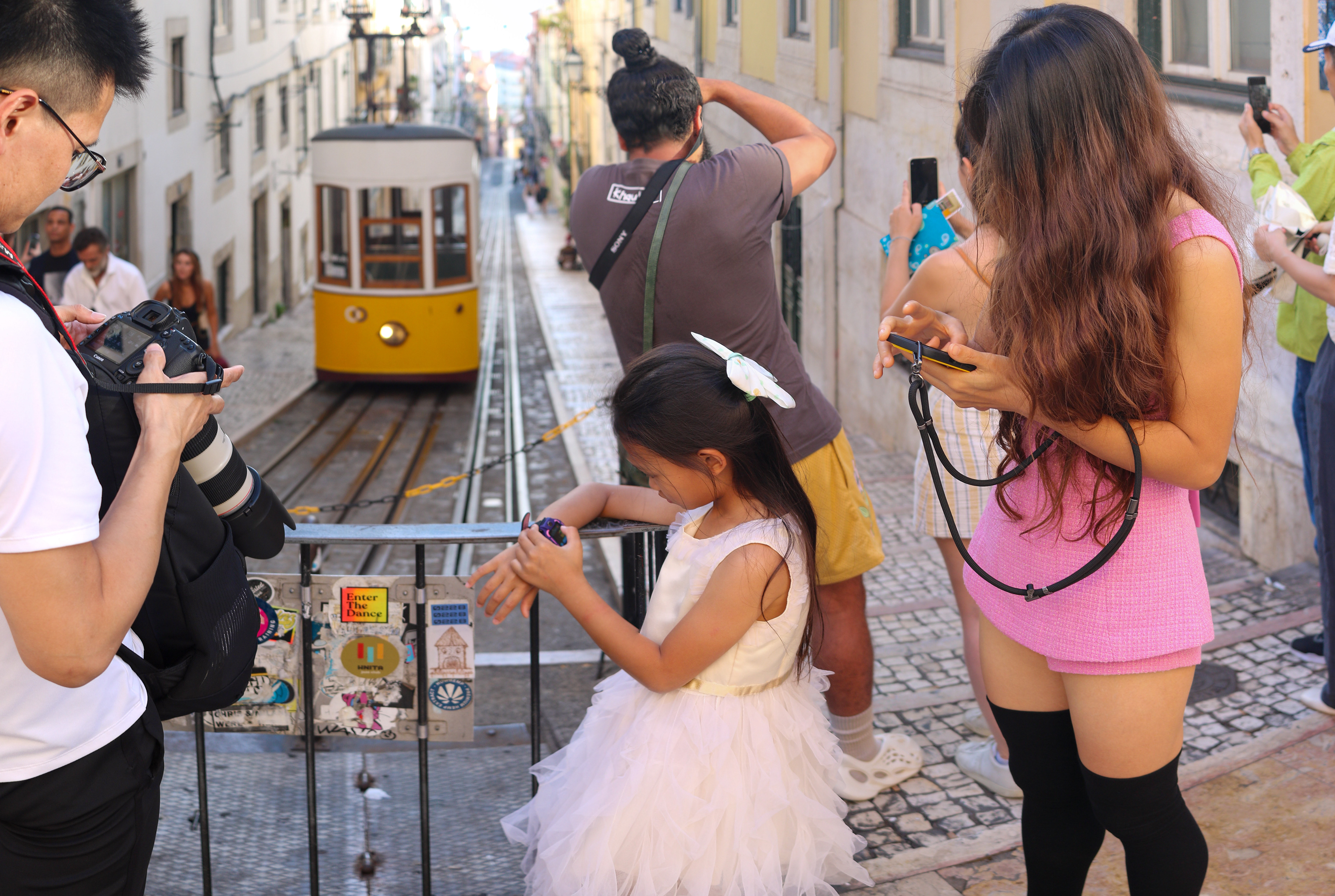 Enter the wider scene: the yellow tram climbing the steep incline of Lisbon’s iconic street, framed by historic pastel façades. On its own, the tram shot is a postcard moment. But merge it with the people-centered frames, and the result is something more layered—a real slice of Lisbon, with tourists and locals weaving around one of the city’s most recognizable backdrops. The stitched panorama shows not just the tram’s journey, but also the way it pulls people together, cameras raised, children curious, and strangers pausing for that perfect memory.