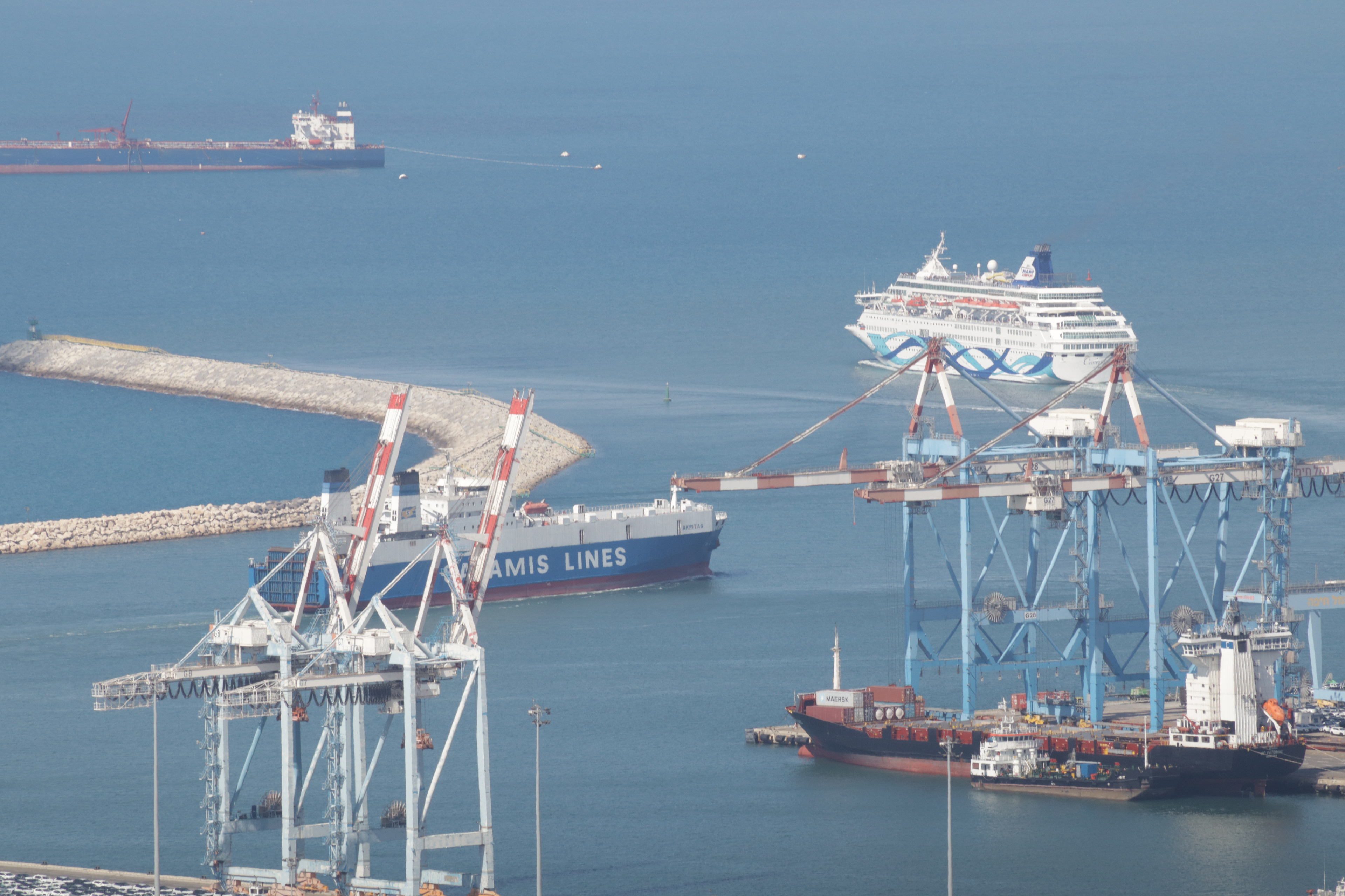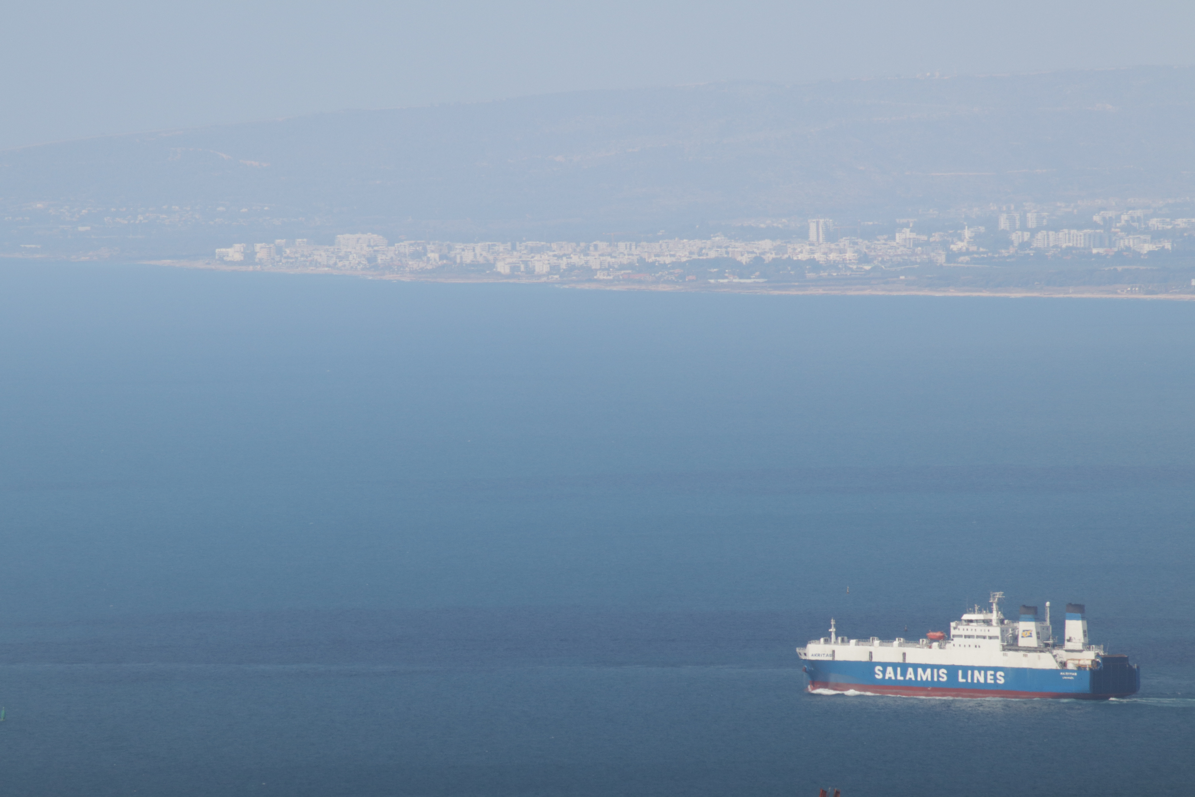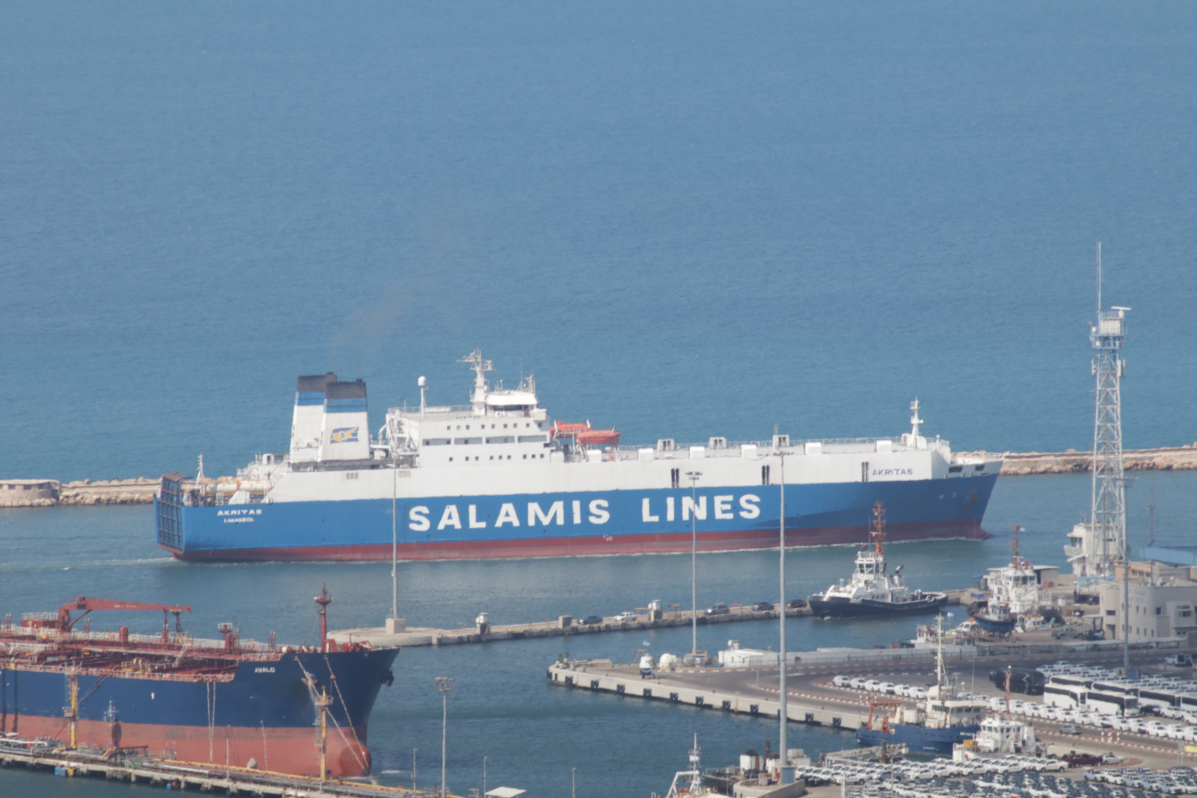 The quiet bustle of a Mediterranean port comes alive in this series of images, showcasing the diverse range of maritime traffic, from commercial freighters to sleek cruise ships. In the first image, we see a large blue and white ship proudly bearing the name “Salamis Lines,” a well-known Cypriot shipping company. The ship, marked "AKRITAS" from Limassol, sits calm in the turquoise harbor, its imposing structure dwarfing the smaller tugboats dotting the scene. The port itself is orderly, with towering cranes in the background poised to unload or load goods onto waiting vessels. The tranquility of the water contrasts with the heavy-duty industrial presence of the ship, a symbiosis that represents the lifeblood of global commerce.