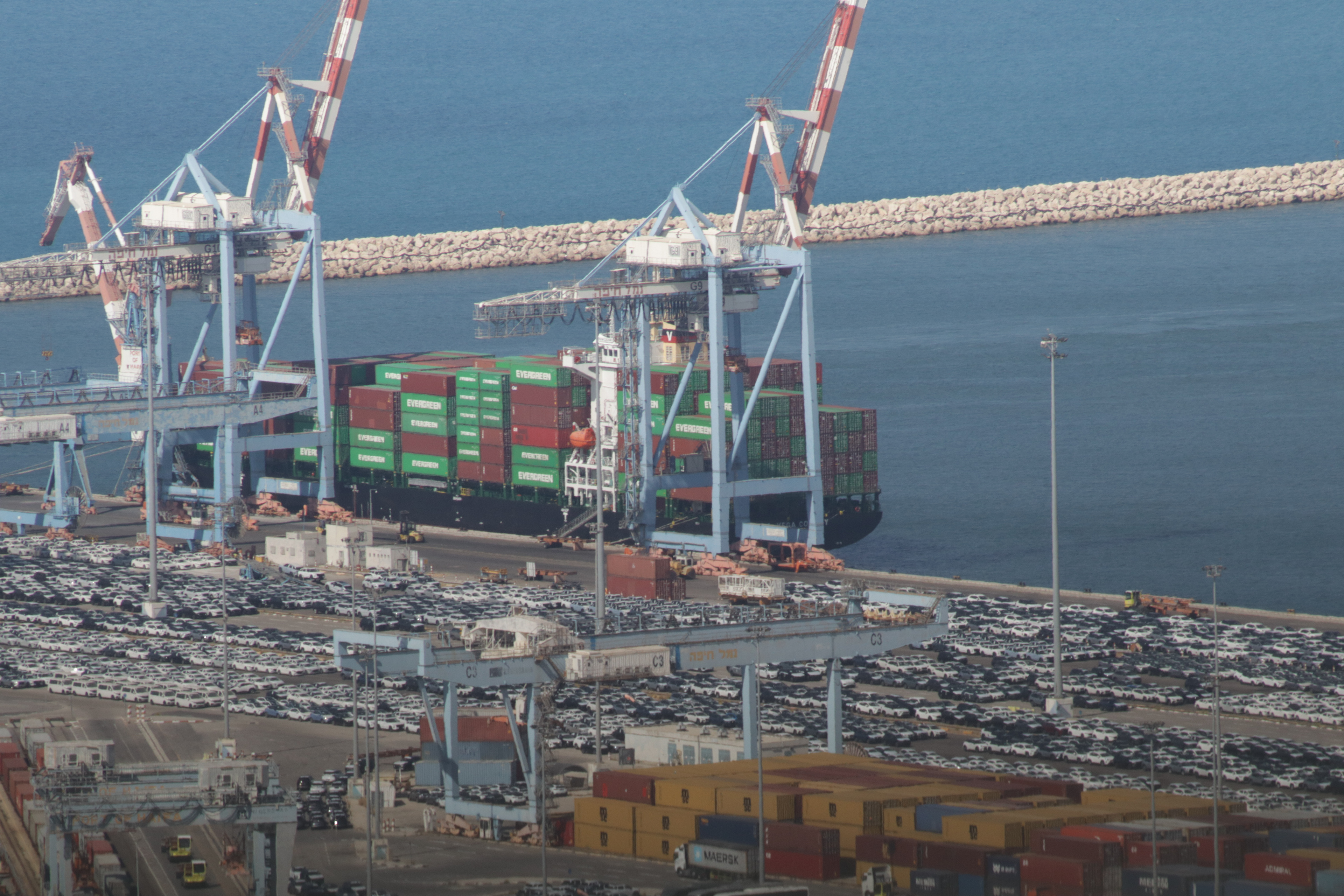 The second image draws us deeper into the industrial side of the port, where gigantic cranes reach into the sky, their skeletal arms extended over a container ship. The ship is docked, waiting patiently beneath these metal giants, stacked high with green "Evergreen" containers. In the background, a bright white cruise ship with an intricate blue design, sporting the familiar logo of AIDA Cruises, glides serenely by, hinting at the leisure and adventure that stand in stark contrast to the gritty work happening at the docks. The interplay between leisure cruises and industrial operations gives the scene a layered dynamic, a port as a crossroad of pleasure and work, trade and travel.