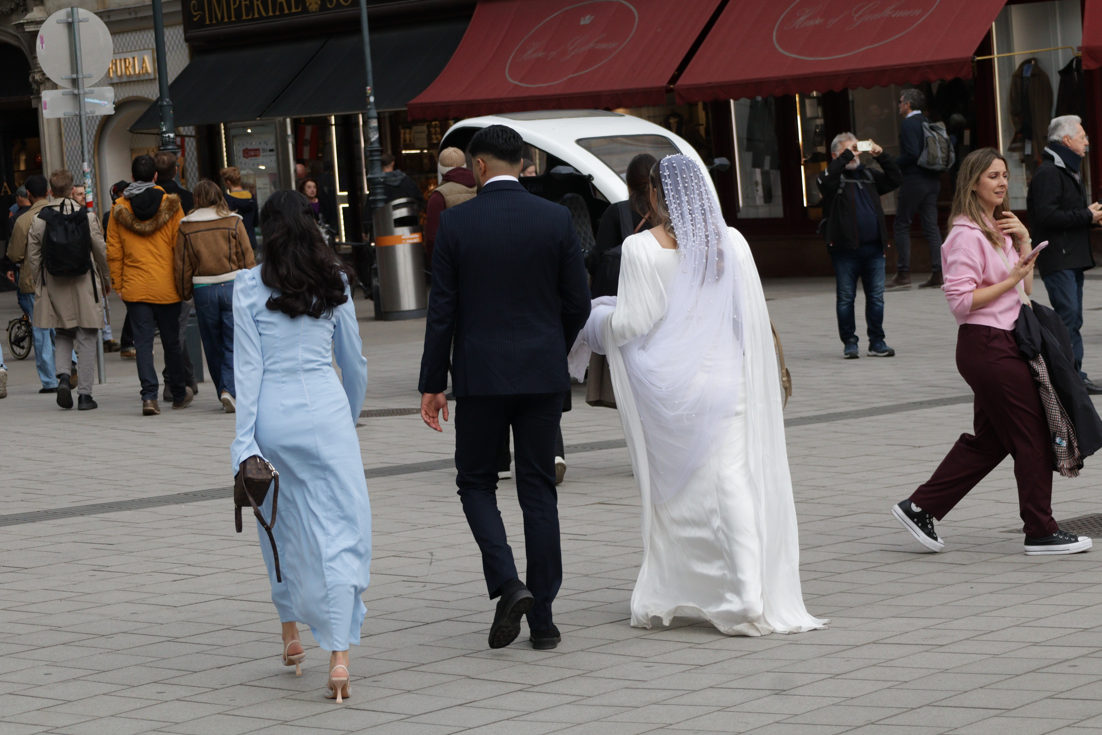 Every now and then, city streets surprise you. Amid the swirl of coats, phones, and espresso cups, a small procession moves through the urban hum—a bride in white, a groom in dark blue, and a companion in pastel elegance. They cut through the ordinariness like a slow melody drifting across traffic noise. The bride lifts her gown slightly to keep it from brushing the pavement, the veil scattering pearls of reflected light, while pedestrians continue their unbroken routines—heads down, phones out, bags swinging. This moment, caught somewhere between the spontaneous and the cinematic, is exactly where street photography finds its poetry.